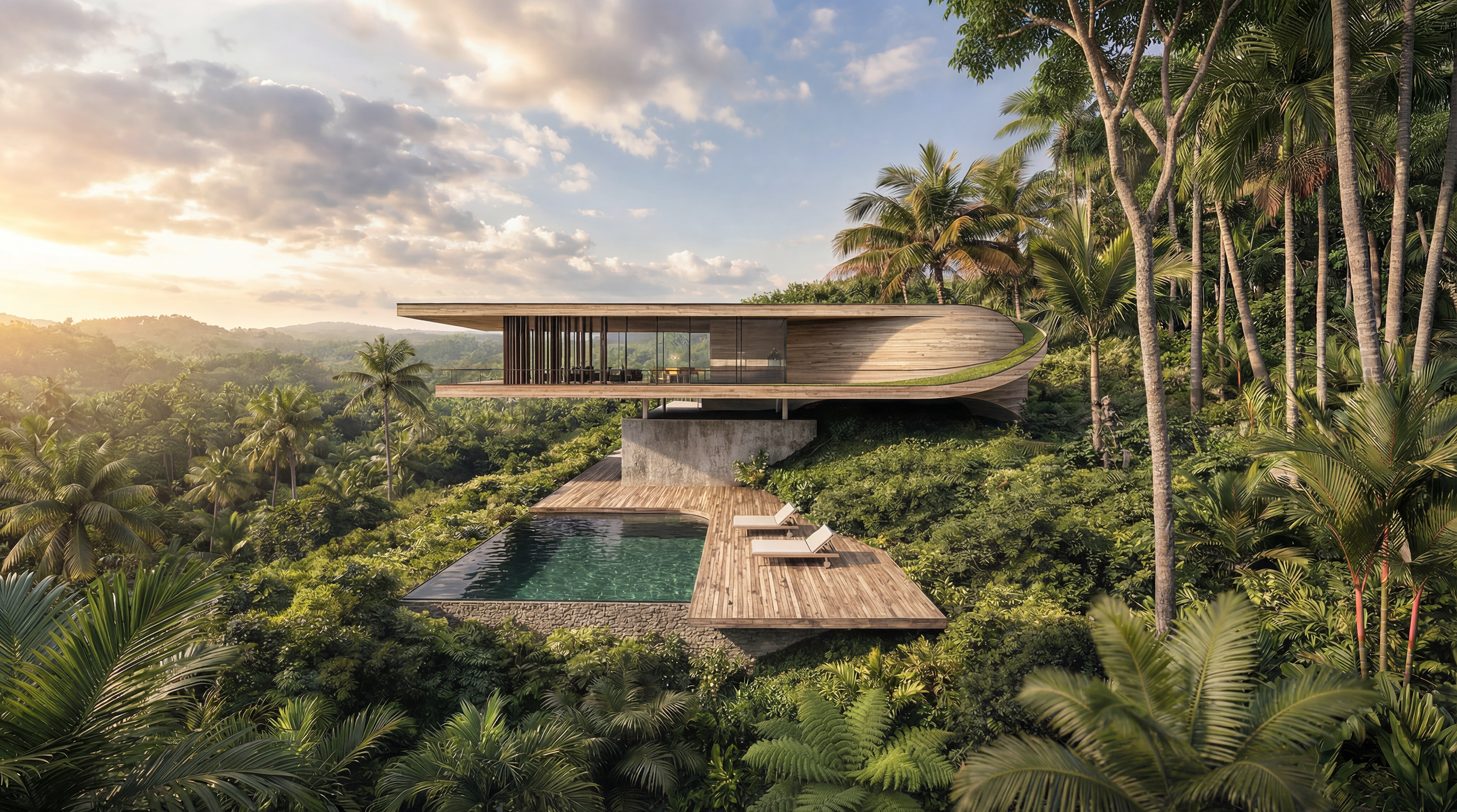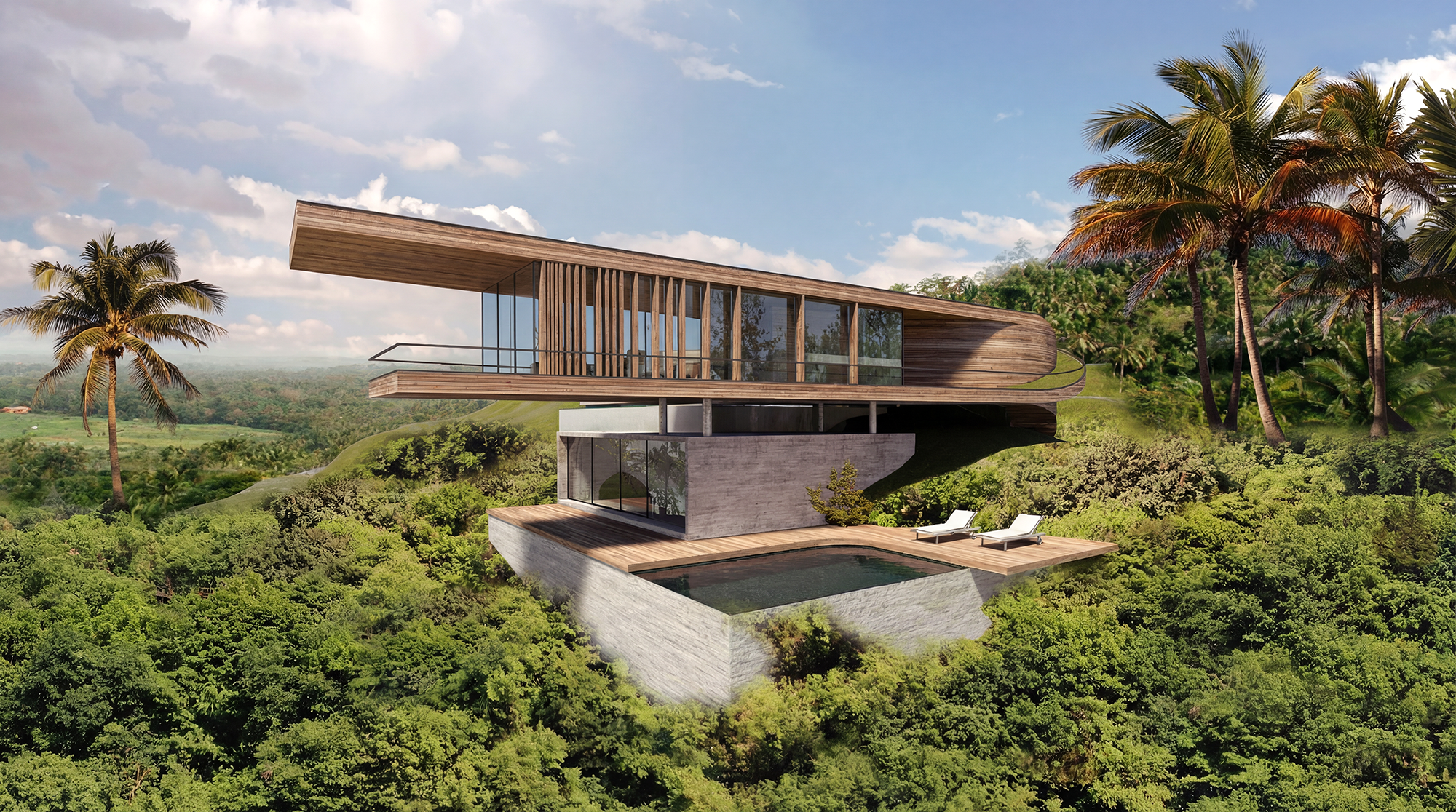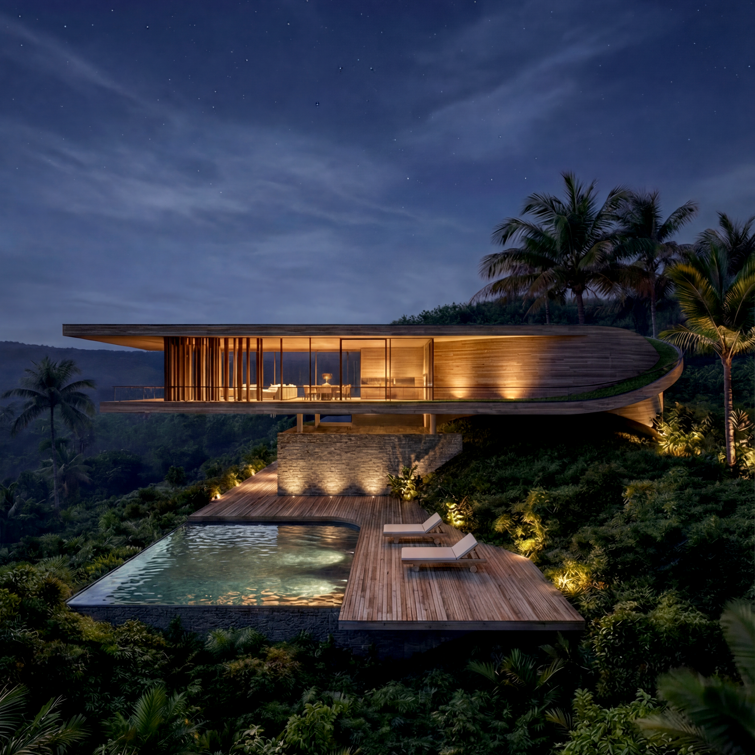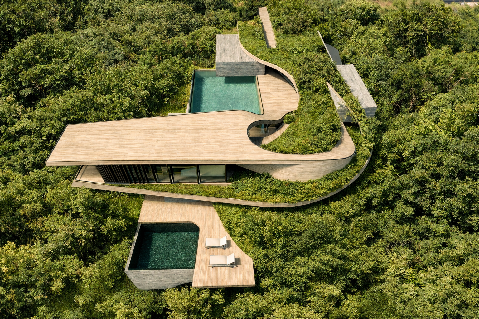 Designed for private client, the architectural site of the house organizes a large program with minimal intervention to the landscape. situated on a steep slope overlooking a valley, the housing project generously integrates the plan with the surrounding environment and green space. Following a natural continuation of topography and flora and fauna, the main structure is built on two interweaving ‘ribbon’ structures, highlighting the timber and stone facade construction.