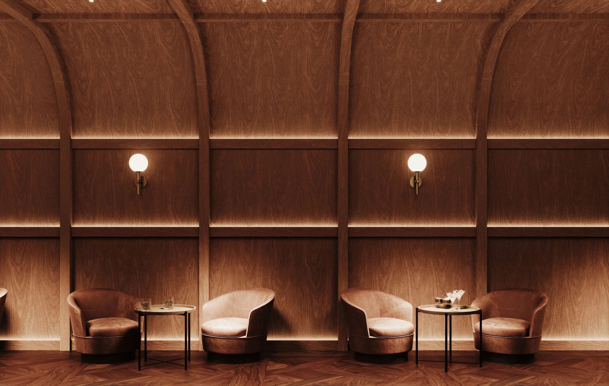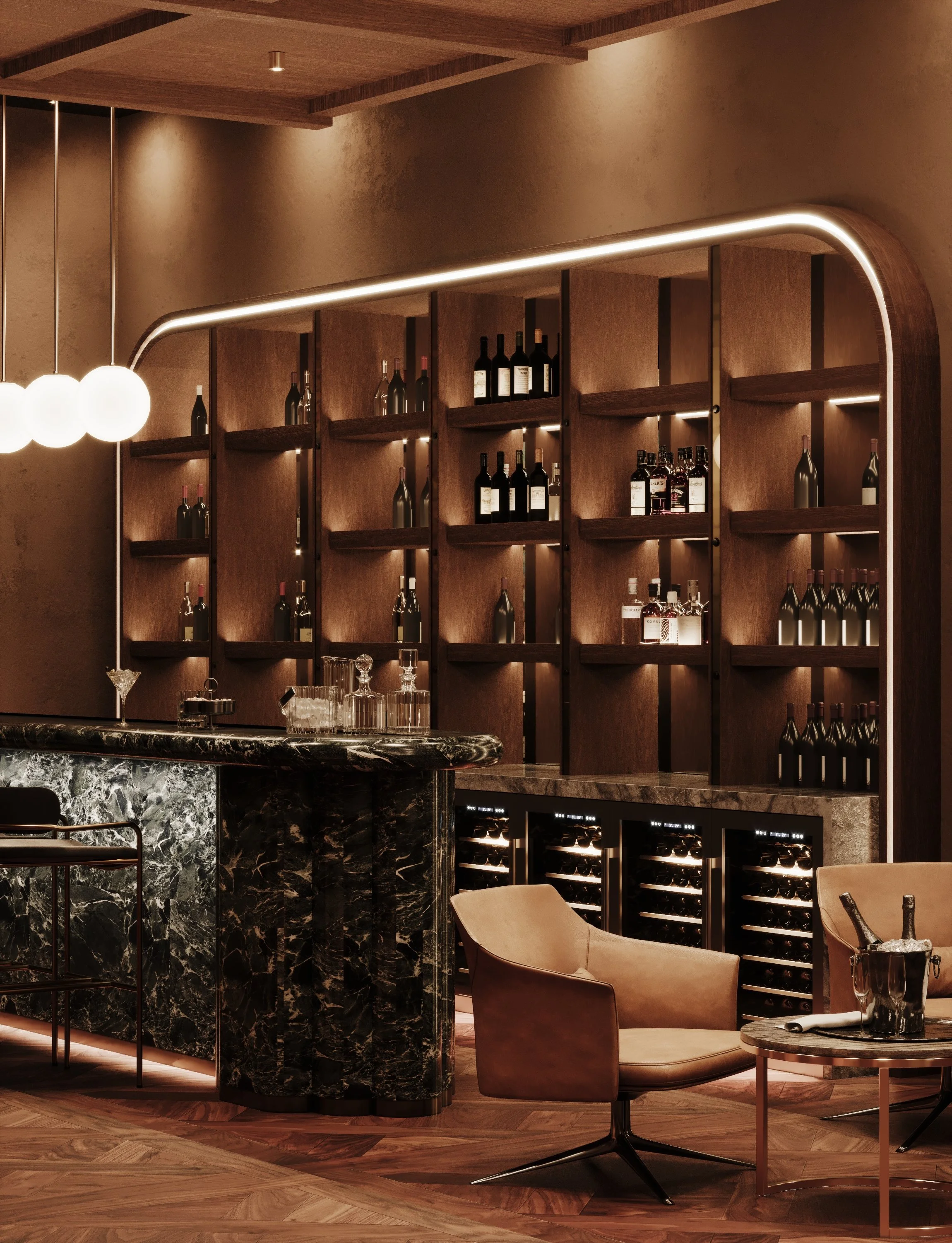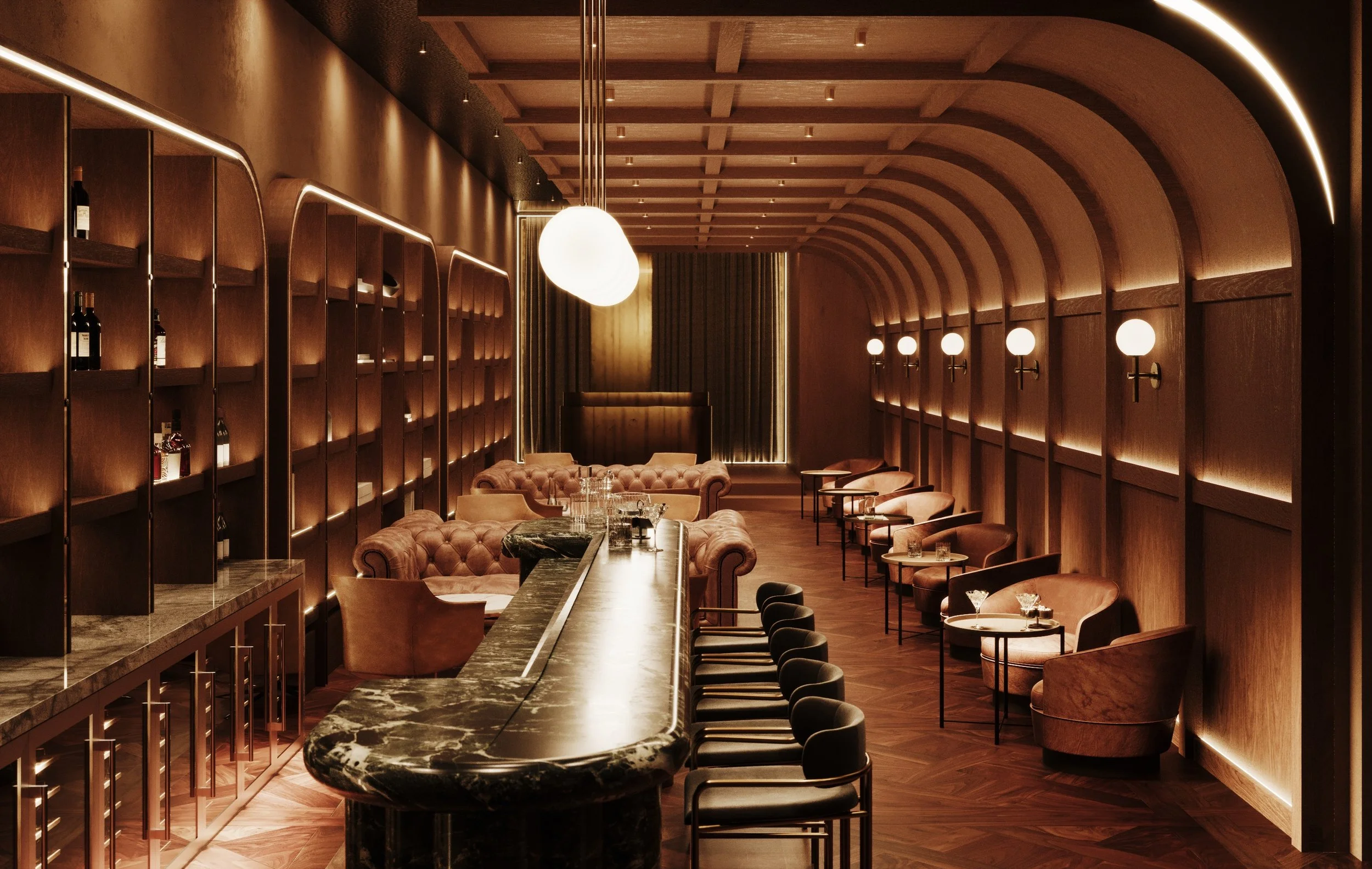 This high-end cocktail bar in Jakarta was conceived as an intimate retreat from the intensity of the city, a space where architecture, music and atmosphere blend into a warm, immersive experience. Inspired by the spatial intimacy of classic jazz clubs, the design embraces a layered composition of textures, curved forms and warm material tones that create a sense of depth and comfort. Softly curved architectural elements guide movement through the venue, forming intimate seating pockets and lounge areas that encourage slow conversations and lingering evenings. Arched timber structures, framed wall panels and layered ceiling forms introduce rhythm and repetition, subtly echoing the cadence and improvisation of jazz music. Materiality plays a central role in shaping the mood of the space. A rich palette of warm woods patinated copper and textured leather establishes a tactile environment that feels both refined and relaxed. Hammered metal ceilings catch and diffuse the ambient light, while deep green marble bar counters add weight and contrast to the otherwise warm tonal composition.