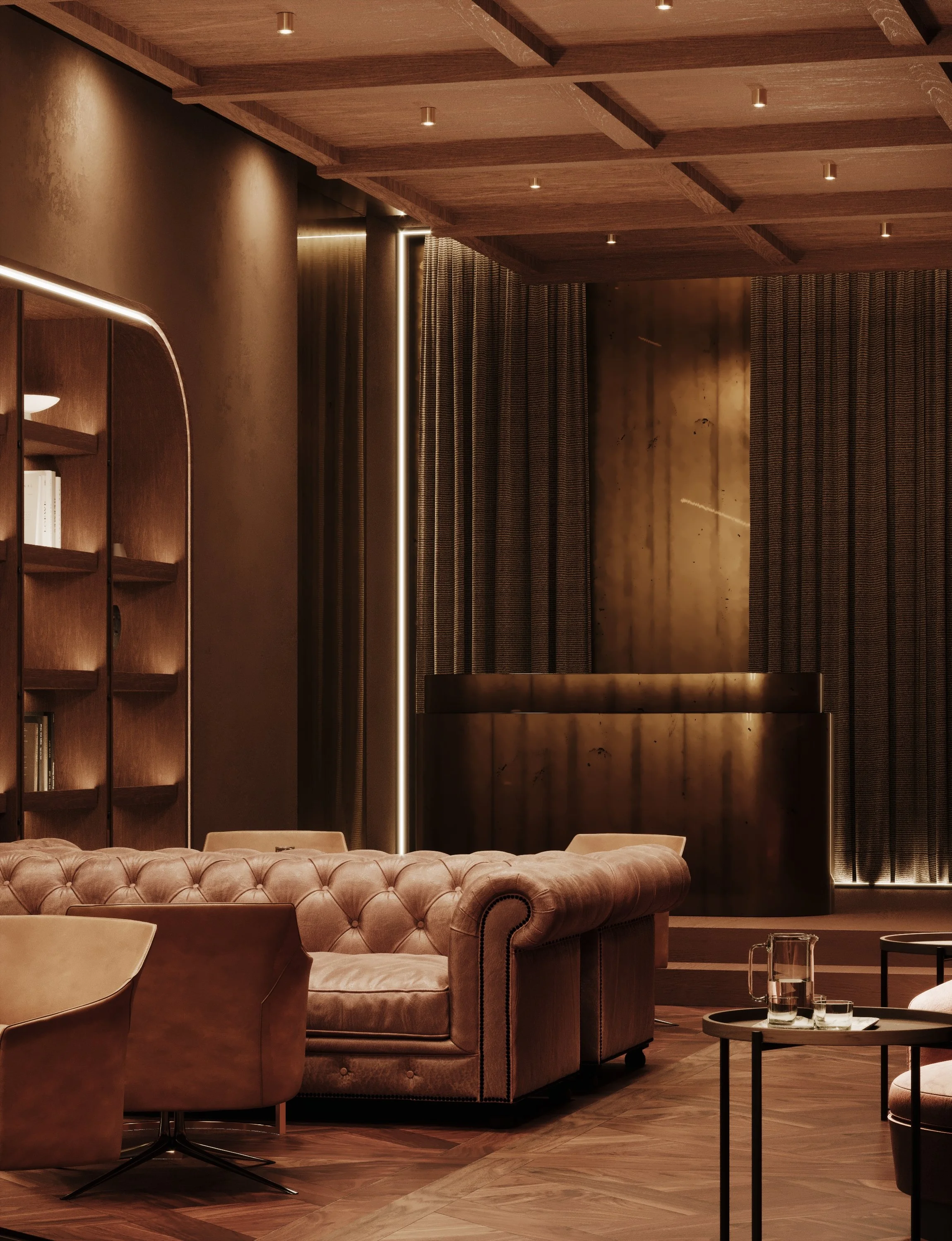 Soft, layered lighting enhances the architectural textures and creates a warm glow throughout the space, reminiscent of the dimly lit interiors of classic jazz lounges. The result is an environment that feels both cinematic and inviting — a place designed not only for dining and cocktails, but for atmosphere, conversation and music. The project explores how architecture can shape experience through intimacy, material richness and spatial rhythm, translating the spirit of jazz into a contemporary hospitality setting.