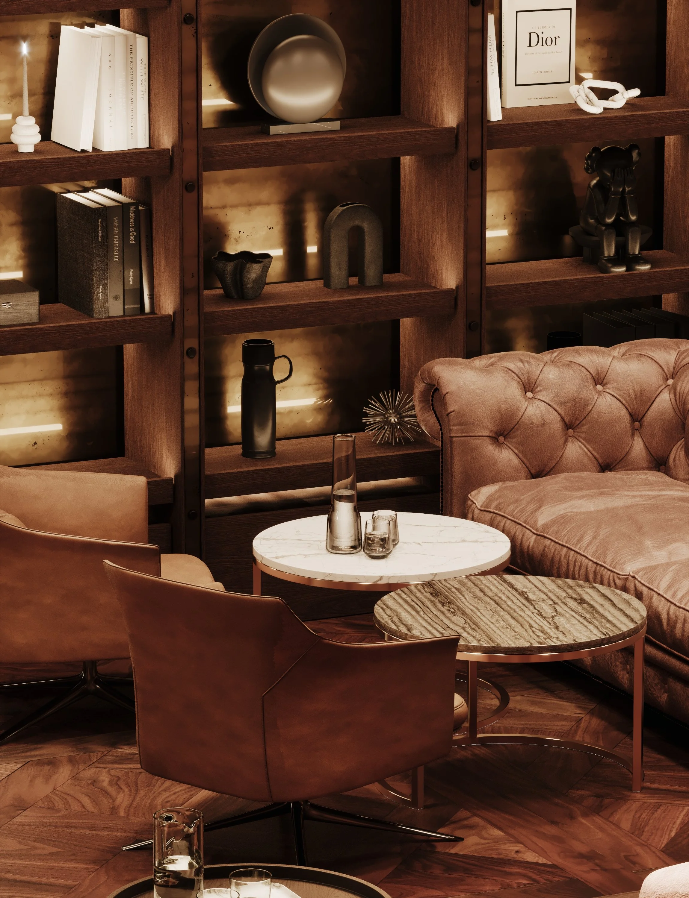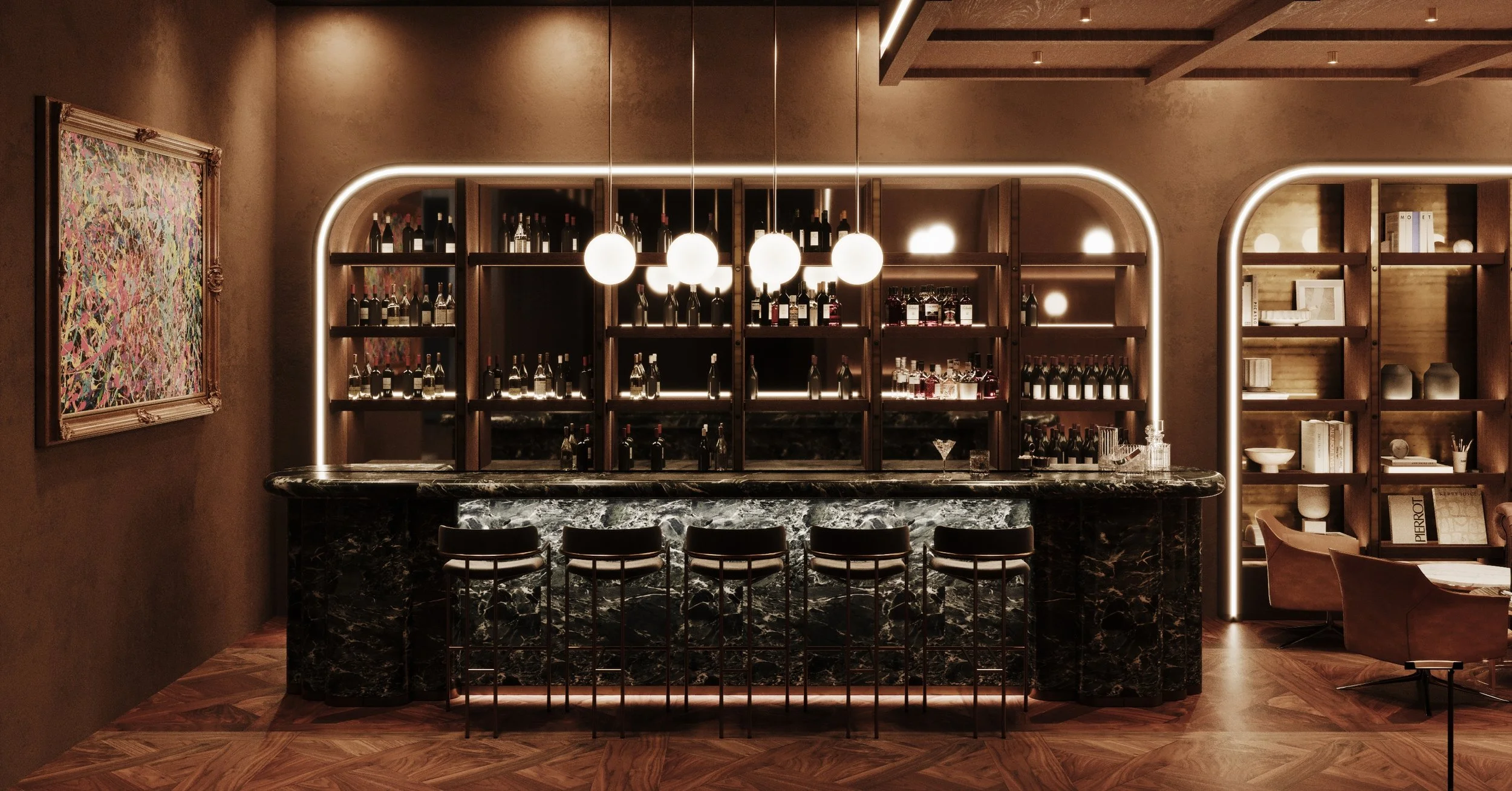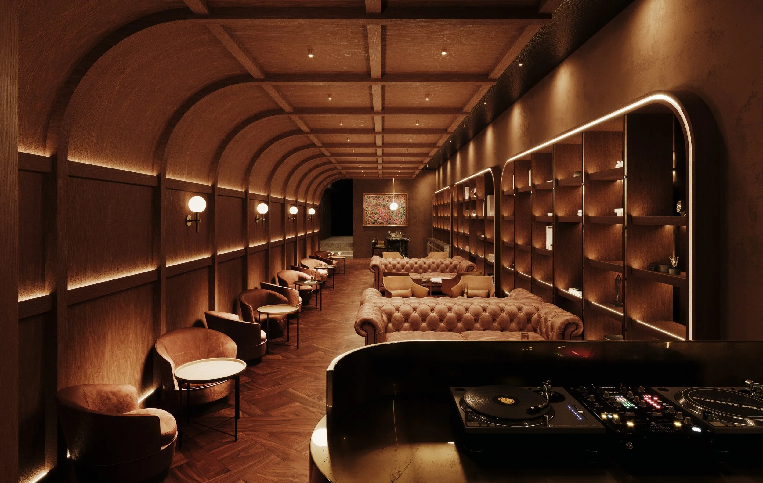 The bar itself acts as the social heart of the venue — a sculptural focal point framed by illuminated shelving and curated displays. Surrounding lounge areas combine plush seating, intimate lighting and library-like shelving filled with objects, books and records, reinforcing the atmosphere of a sophisticated yet relaxed gathering place.