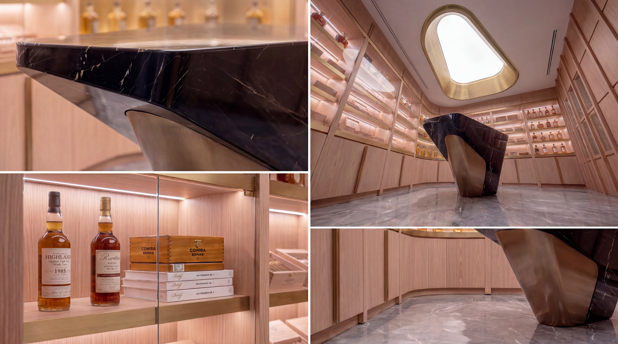 The ceiling becomes a defining element, with a soft, organic aperture framed in brushed metal, diffusing light in a way that feels natural yet controlled. This intervention introduces a subtle sense of openness, counterbalancing the enclosure typically associated with cigar lounges.