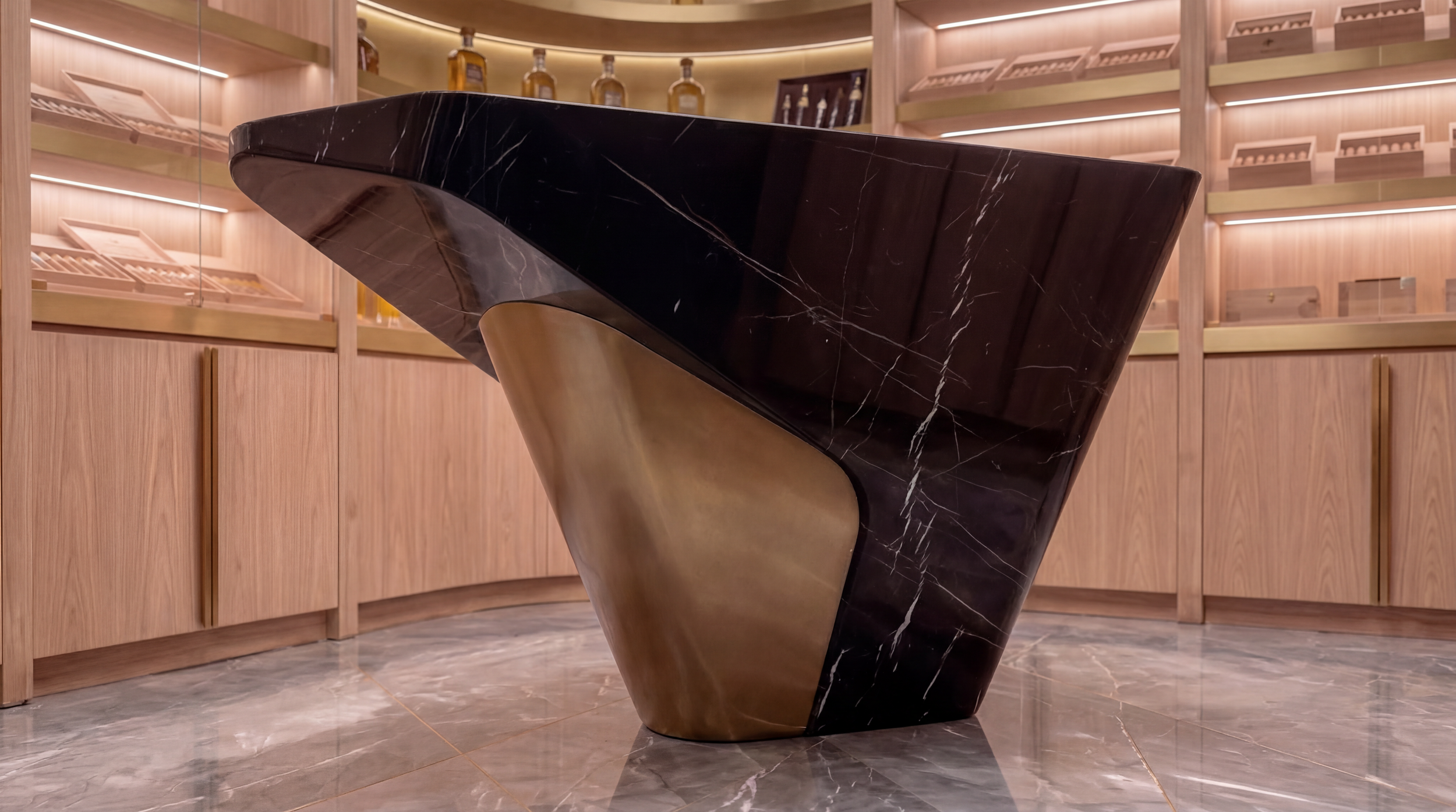 This cigar lounge redefines the typology through a precise balance of materiality, atmosphere, and contemporary form. Moving away from the expected dark, club-like interiors, the space introduces a lighter, more refined spatial language where craftsmanship, display, and ritual are elevated into a curated experience. Warm timber wraps the room in a continuous envelope, seamlessly integrating bespoke cabinetry that showcases cigars and rare spirits as collectible objects rather than storage. Soft, indirect lighting is embedded within the architecture, creating a calm, ambient glow that enhances texture and depth while maintaining an intimate mood. A sculptural central table, carved from dark stone with fluid, almost gravity-defying geometry, anchors the space, acting as both functional surface and statement piece.