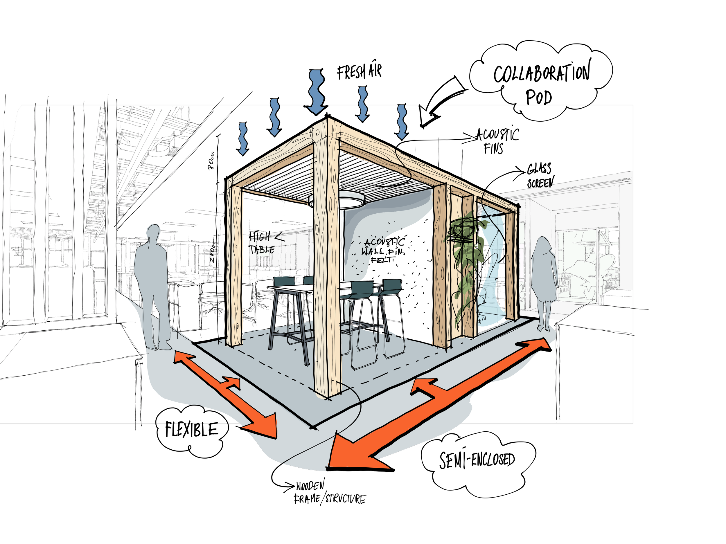 The office’s aesthetic is characterized by a modern, timeless, bright, and spacious feel, shown by choosing a white exposed ceiling concept with white pendant lights. The wooden collaboration pods are designed to facilitate teamwork as well as provide sense of privacy – without creating boundaries and traditional walls. Equipped with acoustic fins, not only do these pods organize the workspace but also act as architectural features, framing the collaboration areas.